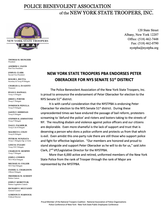 Albany, NY- The Police Benevolent Association of the New York State Troopers released their endorsement of Peter Oberacker for New York State Senate, District 51. Read their letter attached below: